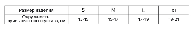• Размер бандажа выбирается согласно таблице подбора изделий по окружности лучезапястного сустава.